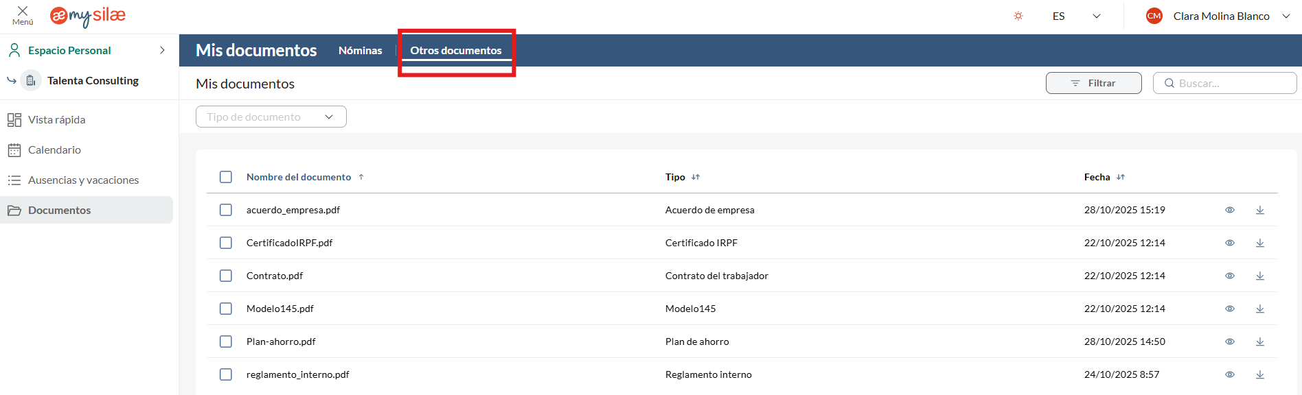 Desde el espacio personal, el usuario puede acceder al módulo Documentos para consultar y descargar sus nóminas y otros documentos.