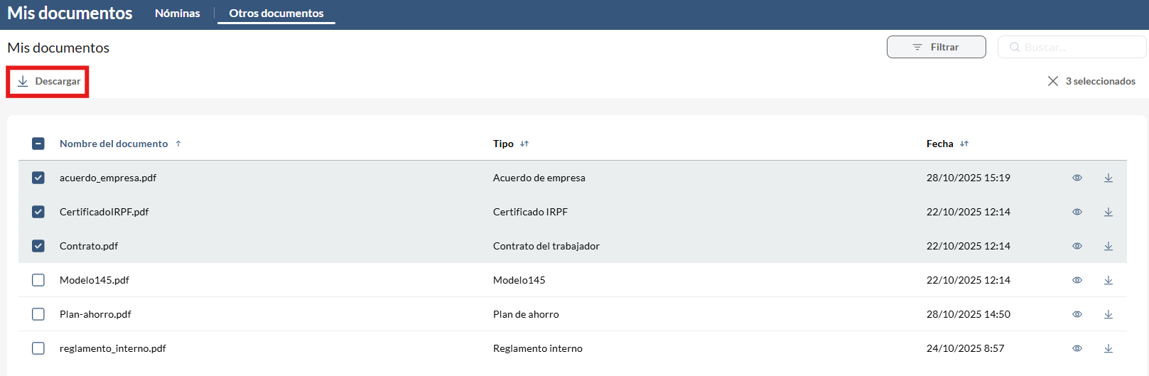 Esta funcionalidad está disponible en el espacio personal de los empleados, únicamente en el caso de que el administrador desee compartir documentos como
