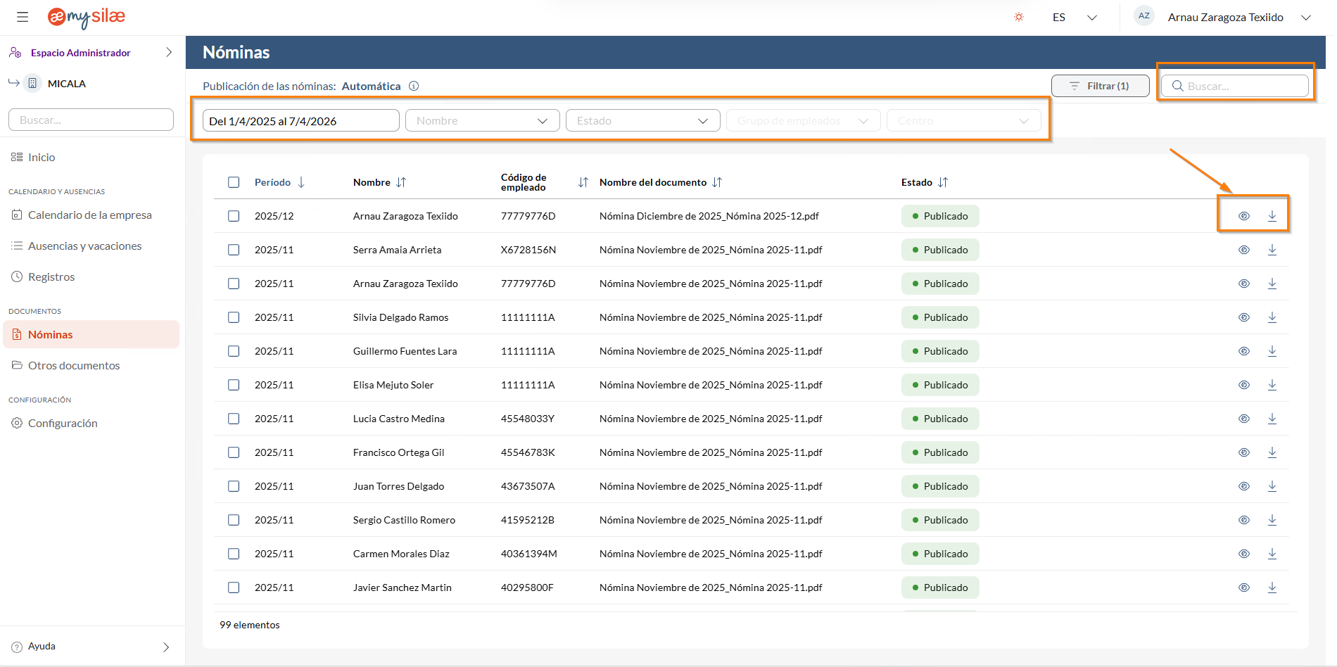 Desde la opción Nóminas, el administrador puede consultar y descargar las nóminas de los empleados.