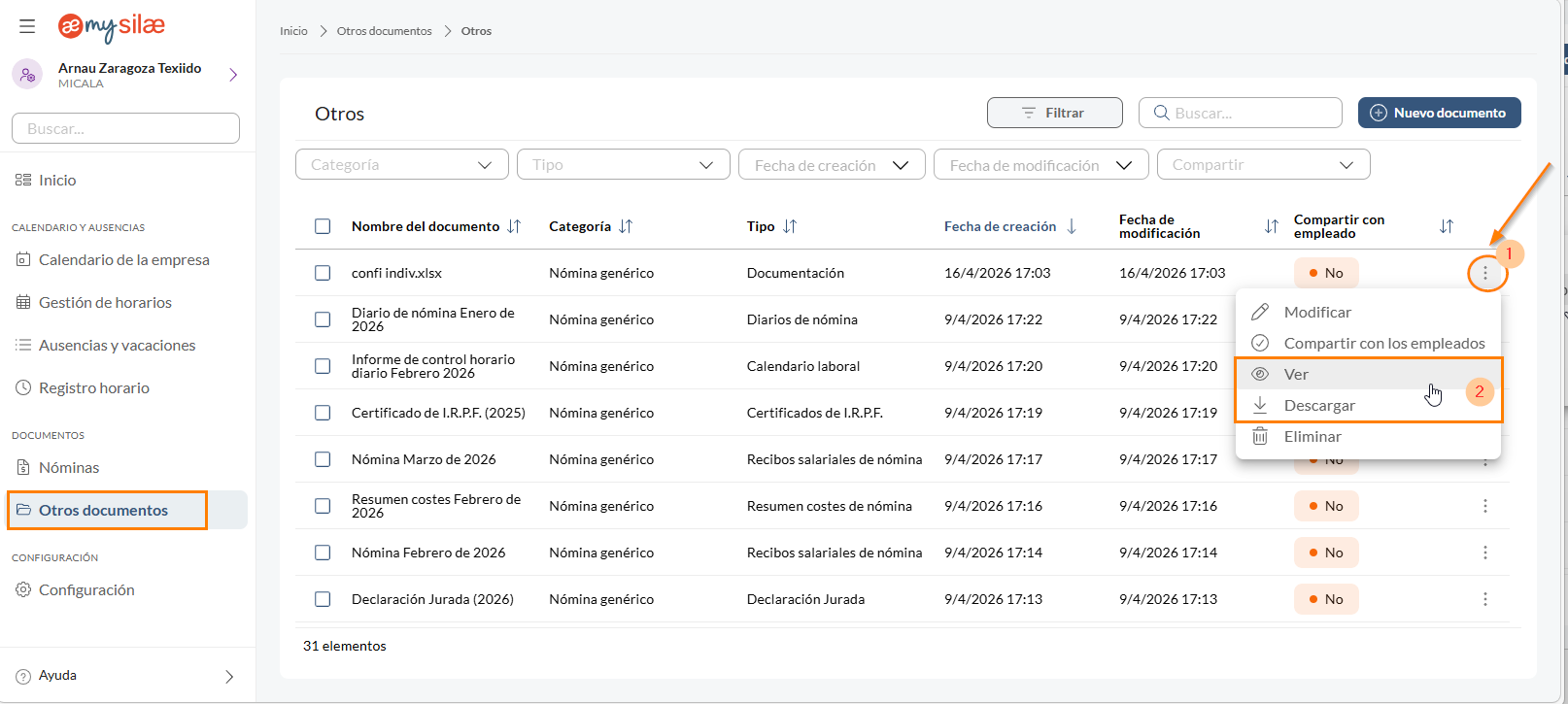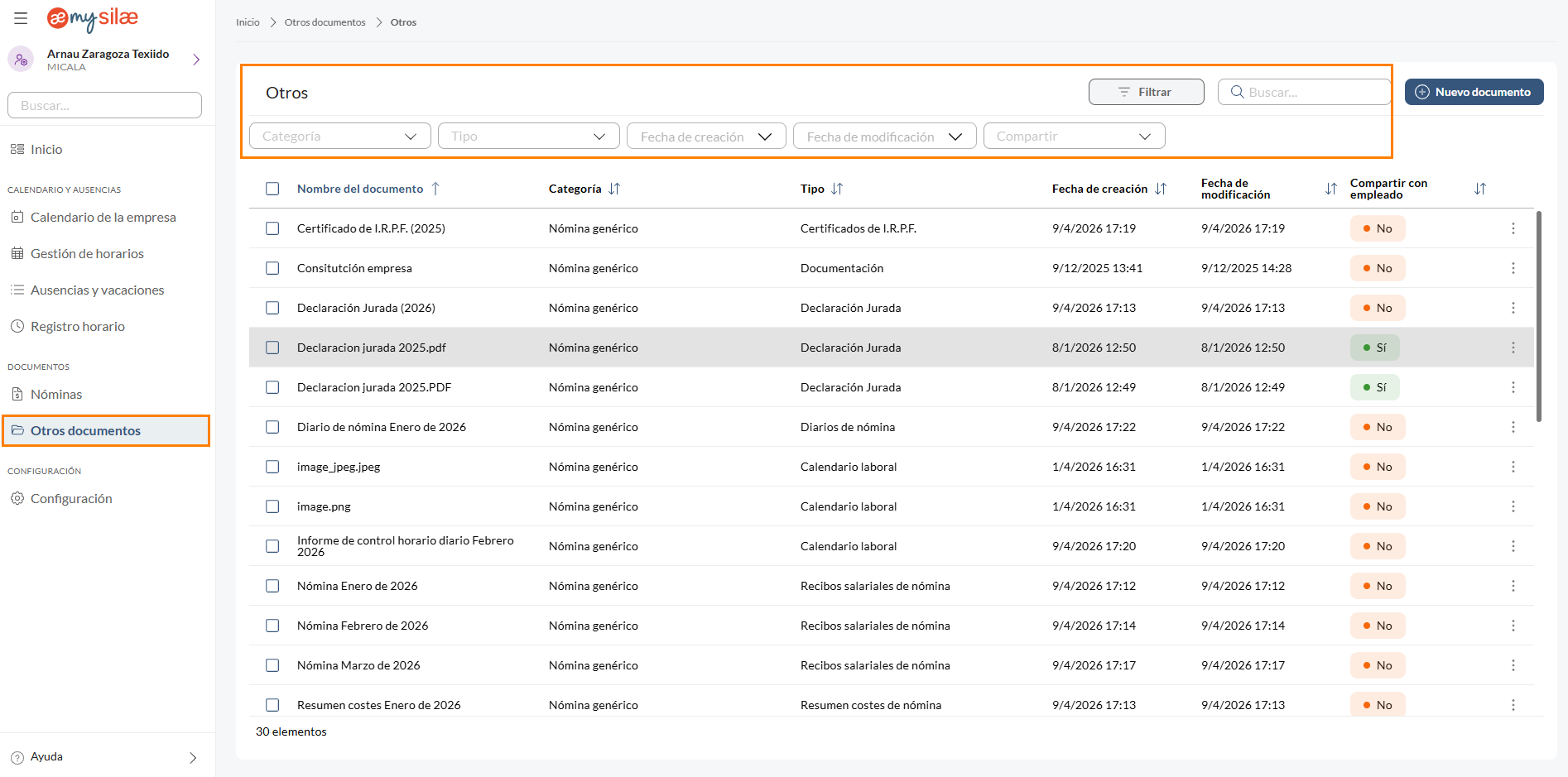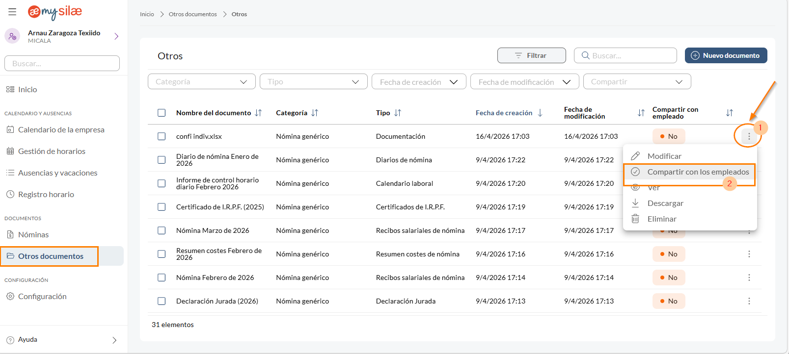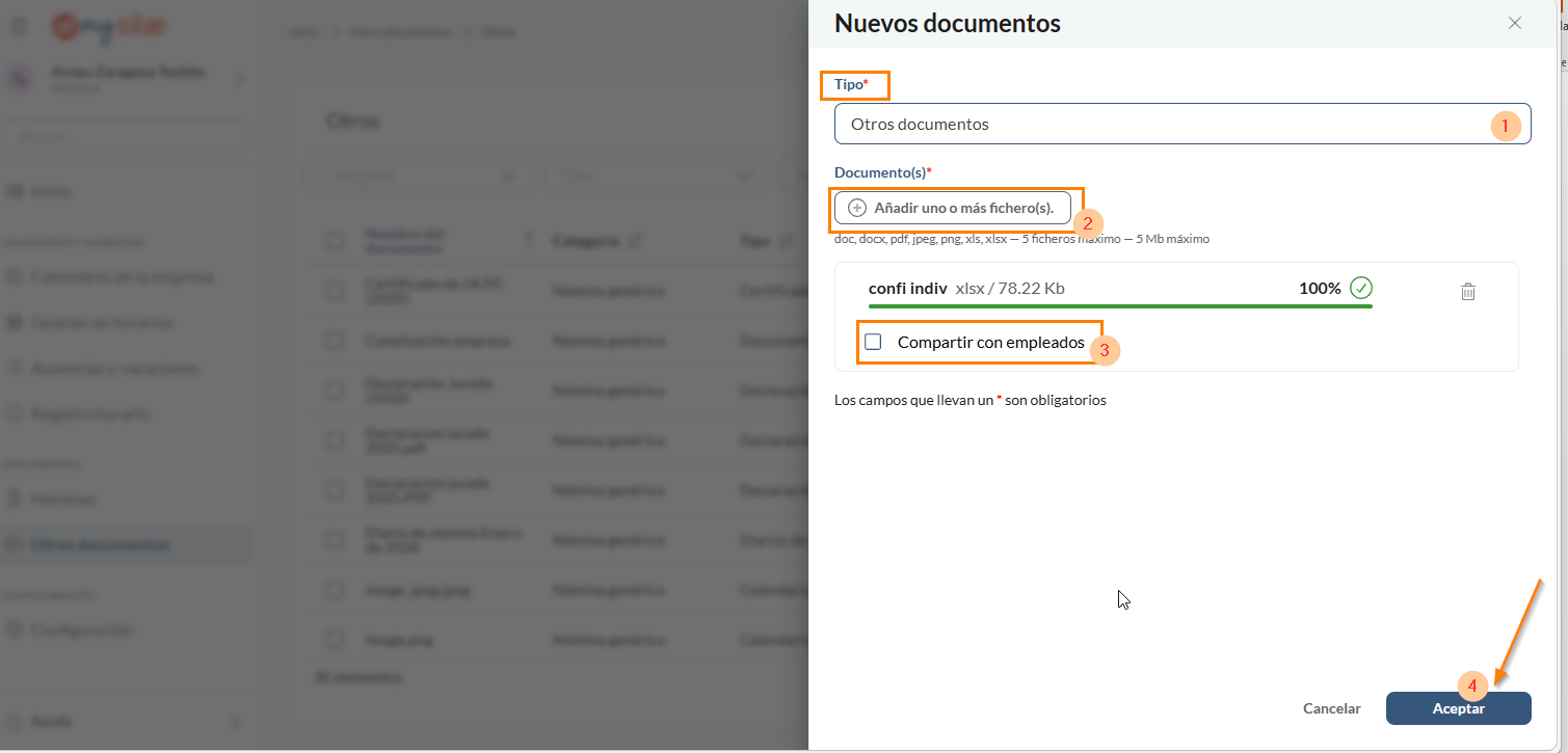 - Si marcas “Compartir con empleados”, los documentos serán visibles para todos los empleados