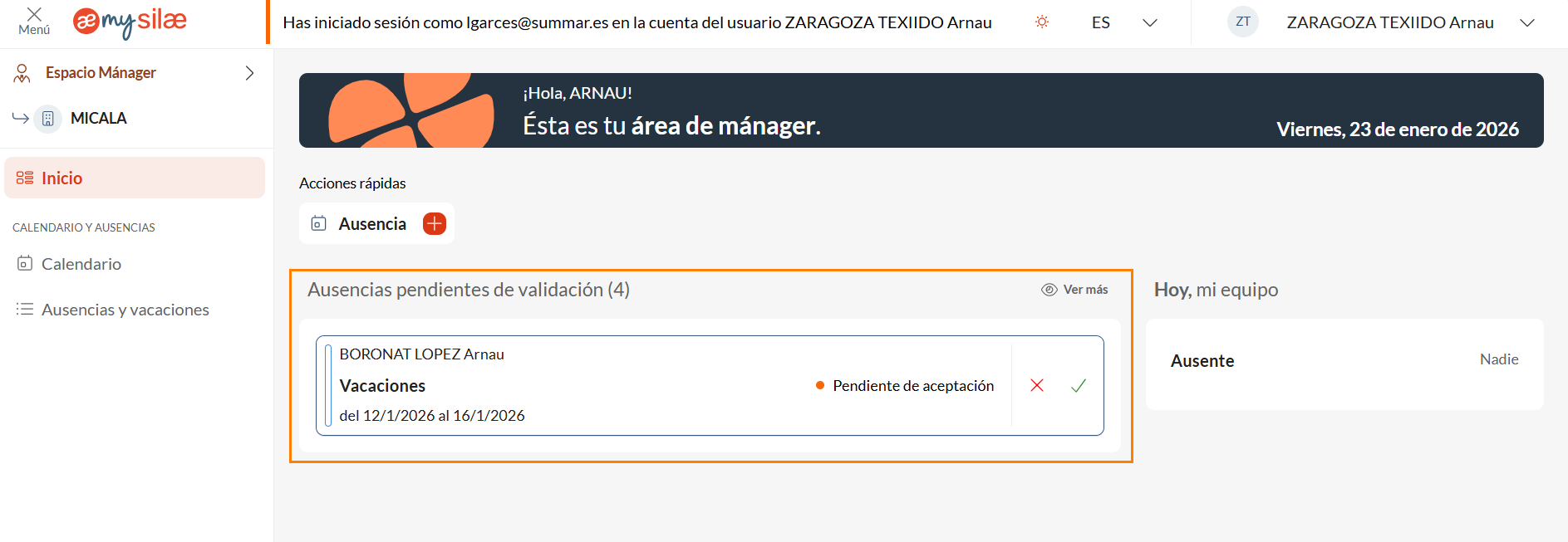 Desde este menú, el mánager dispone de un widget para validar o rechazar ausencias.