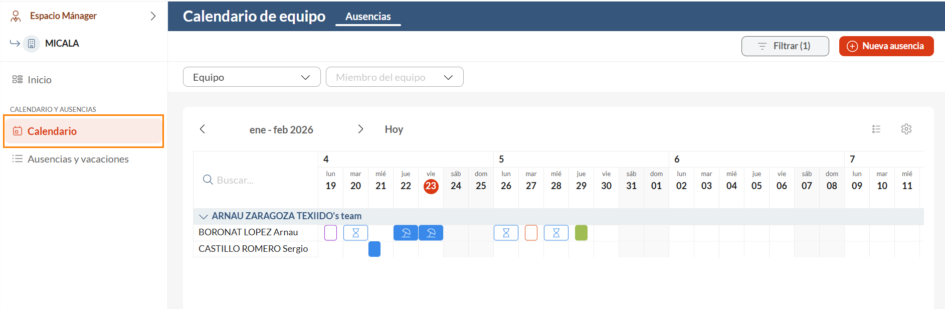 Desde el menú lateral izquierdo, la pestaña “Calendario” permite al mánager acceder a la planificación de su equipo.