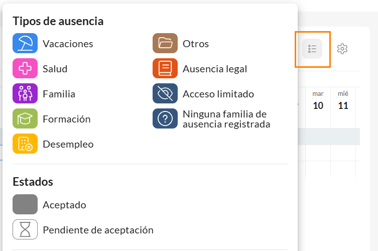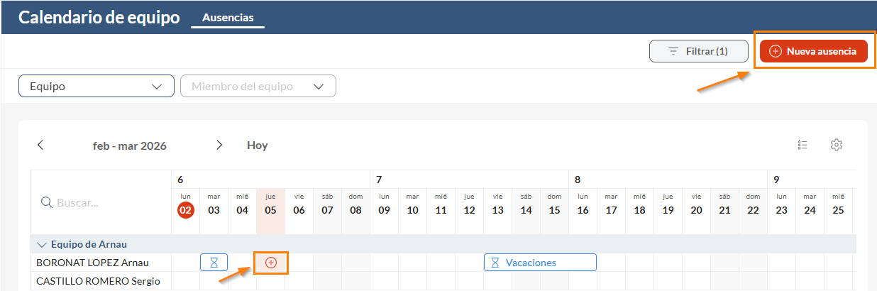 Desde el botón “Ausencias” 🕀 , el mánager puede añadir una ausencia para un miembro de su equipo.