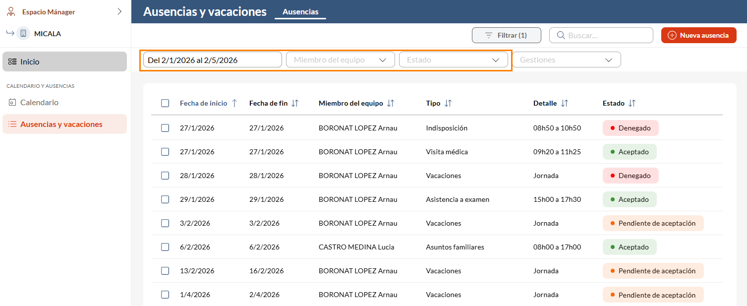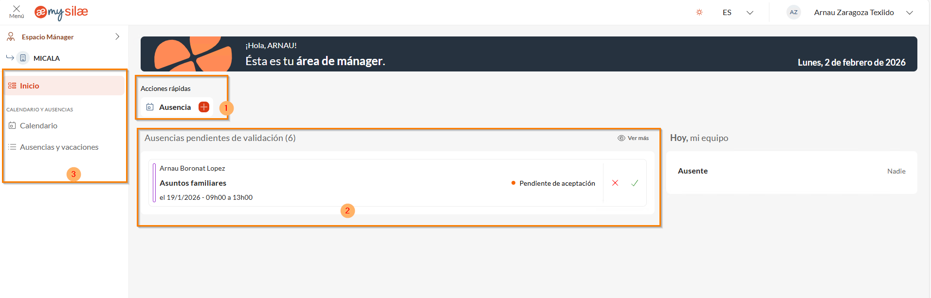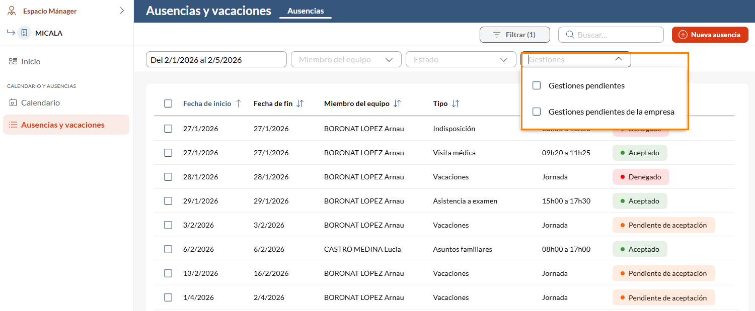 Desde este menú, el mánager también puede consultar y gestionar las solicitudes de ausencias de su equipo.