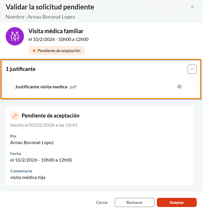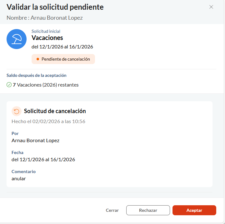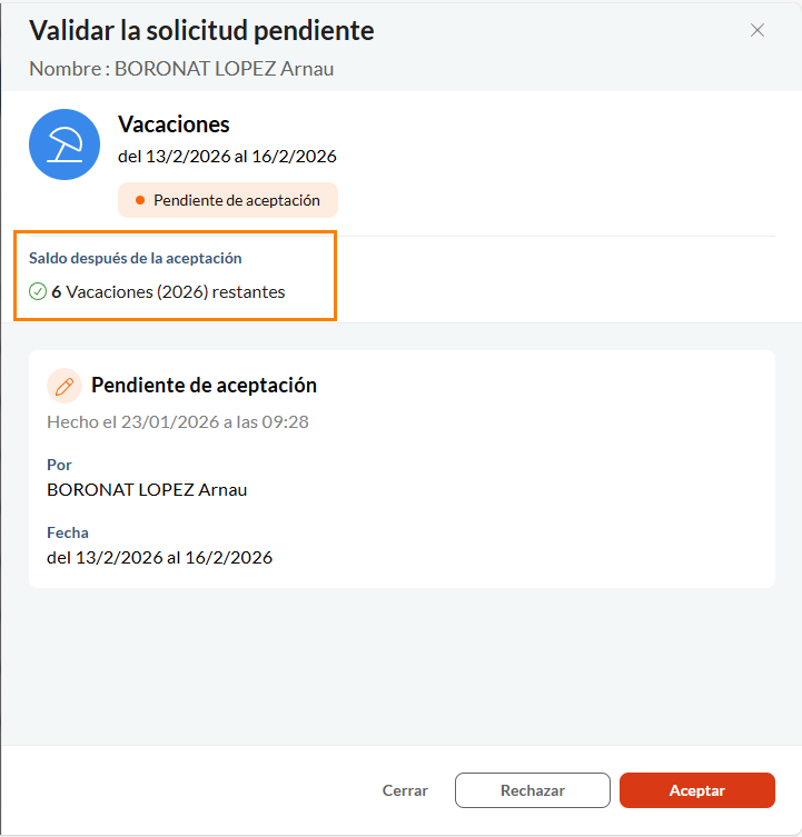 Al hacer clic sobre una línea de ausencia el mánager accede al detalle de la solicitud, con ayuda para la validación y ver el detalle de los contadores de la persona empleada. El mánager puede "Aceptar" o "Rechazar" la solicitud: