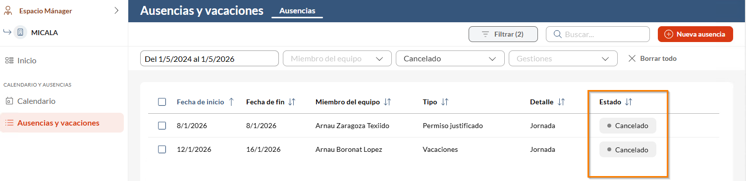 Si la solicitud de cancelación es aceptada, la ausencia pasa al estado “Cancelado”: