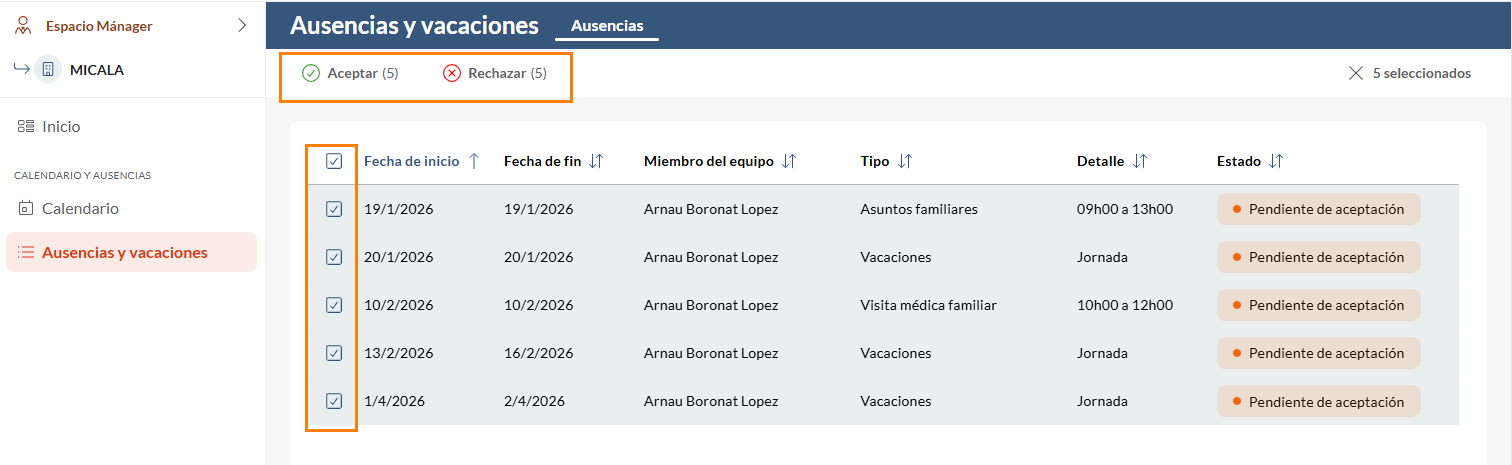 También es posible validar o rechazar ausencias de manera masiva, seleccionando las ausencias “Pendientes de validación” y haciendo clic en “Aceptar” o “Rechazar”: