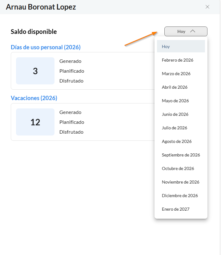 - Consultar los contadores y realizar simulaciones hasta 12 meses para cada miembro del equipo haciendo clic en el nombre y apellidos de la persona empleada.